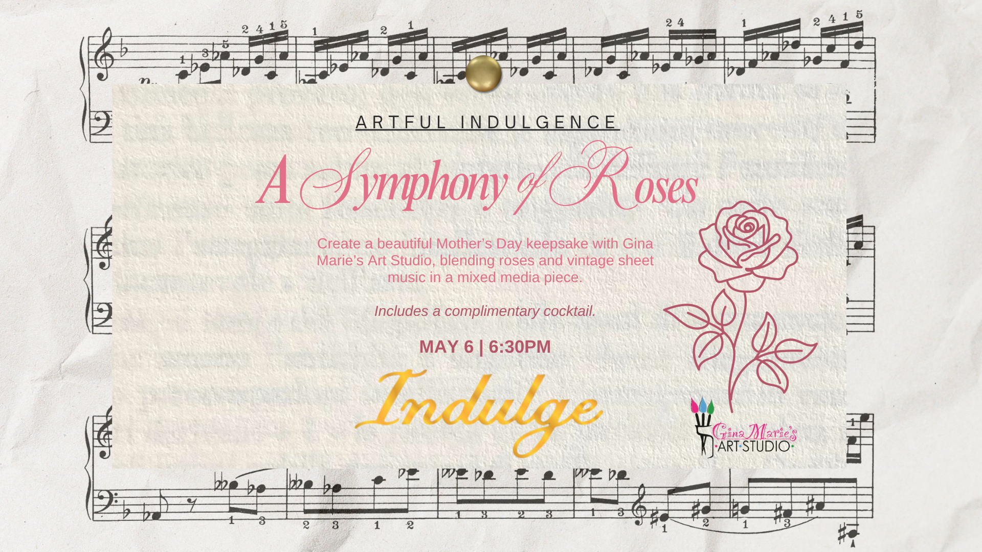 Back to All Events May Artful Indulgence - A Symphony of Roses Wednesday, May 6, 2026 6:30 PM 8:30 PM Indulge Wine Bar 21 Truss Drive Boerne, TX, 78006 United States (map) Google Calendar ICS Artful Indulgence - A Symphony of Roses Join us on May 6th at 6:30pm for Artful Indulgence - A Symphony of Roses. We will be creating a wonderful Mother’s Day keepsake. All tickets include a complimentary cocktail to sip while creating your masterpiece! GET TICKETS